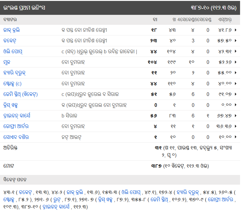 ବ୍ରହ୍ମପୁର,,୧୧/୭|୨୦୨୫( ଖବର ସଙ୍ଗେ ସଙ୍ଗେ ବ୍ୟୁରୋ) :ଆଜି ଲଣ୍ଡନ ର ଲର୍ଡ୍ସ ପଡିଆ ରେ ଭାରତ ଏବଂ ଇଁଙ୍ଗ୍ଲଣ୍ଡ ମଧ୍ୟରେ ପାଞ୍ଚ ମ୍ଯାଚ ବିଶିଷ୍ଠ ତେନ୍ଦୁଲକର-ଆଣ୍ଡରସନ ଟେଷ୍ଟ ଶୃଙ୍ଖଳା ର ତୃତୀୟ ମ୍ଯାଚ ଆରମ୍ଭ ହୋଇଛି। ଏହି ମ୍ଯାଚ ରେ ଇଁଙ୍ଗ୍ଲଣ୍ଡ ଅଧିନାଯକ ବେନ ସ୍ଟୋକ ଟସ ଜିତି ପ୍ରଥମେ ବ୍ୟାଟିଂ କରିବାର ନିସ୍ପତି ନେଇଛନ୍ତି। ଇଁଙ୍ଗ୍ଲଣ୍ଡ ପକ୍ଷରୁ ଦୁଇ ପ୍ରାରମ୍ଭିକ ବ୍ୟାଟସମ୍ୟାନ ଜାକ କ୍ରାଲେ ଏବଂ ବେନ ଡକେଟ ପାଳି ଆରମ୍ଭ କରିଥିଲେ। ଆରମ୍ଭରୁ ଭାରତ ର ଦ୍ରୁତ ବୋଲର ମହମ୍ମଦ ସିରାଜ, ଯସପ୍ରୀତ ବୁମରା, ଆକାଶ ଦୀପ ଏବଂ ନିତୀଶ ରେଡି ଇଁଙ୍ଗ୍ଲଣ୍ଡ କୁ ଆଶାନୁରୂପ ରନ ସଂଗ୍ରହ କରିବାକୁ ଦେଇନଥିଲେ। ଖେଳ ଶେଷସୁଧା ଇଁଙ୍ଗ୍ଲଣ୍ଡ ୪ ୱିକେଟ ହରାଇ ୨୫୧ ରନ ସଂଗ୍ରହ କରିଛି। ଭାରତ ପକ୍ଷରୁ ଯସପ୍ରୀତ ବୁମରା ୧ଟି , ନିତୀଶ ରେଡି ୨ଟି ଏବଂ ରବୀନ୍ଦ୍ର ଜାଦେଜା ୧ ୱିକେଟ ଅକ୍ତିଆର କରି ନେଇଛନ୍ତି। ଇଁଙ୍ଗ୍ଲଣ୍ଡ ପକ୍ଷରୁ ଜୋ ରୁଟ୍ ୧୯୧ ଟି ବଲ୍ ର ସାମ୍ନା କରି ୯ଟି ଆକର୍ଷଣୀୟ ଚୌକା ମାଧ୍ୟମ ରେ ଅପରାଜୟ ୯୯ ରନ ସଂଗ୍ରହ କରିଛନ୍ତି ଏବଂ ବେନ୍ ଷ୍ଟୋକ୍ସ ୧୦୨ ଟି ବଲ୍ ର ସାମ୍ନା କରି ୩ଟି ଚୌକା ସହାୟତା ରେ ୩୯ ରନ ସଂଗ୍ରହ କରି ଅପରାଜିତ ଅଛନ୍ତି।